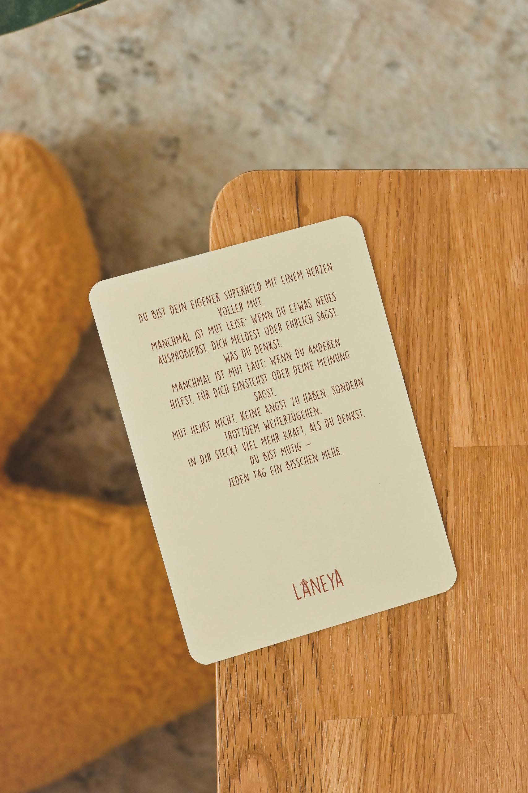Die 20 Karten enthalten unterschiedliche Affirmationen, die Selbstvertrauen, Mut, Achtsamkeit und eine positive Selbstwahrnehmung fördern.