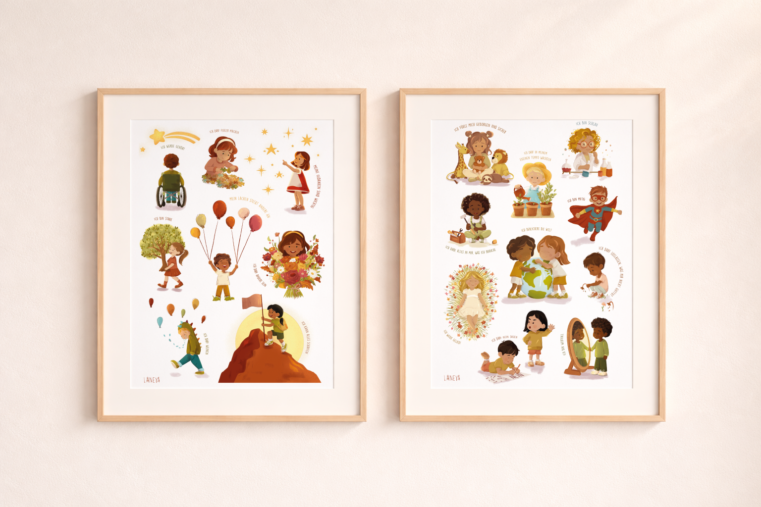 So können die Poster je nach Raum und Einsatzbereich optimal ausgewählt werden. Die beiden Motive ergänzen sich inhaltlich und visuell und eignen sich ideal für Familien, die Kinder langfristig mit positiven Impulsen begleiten möchten.