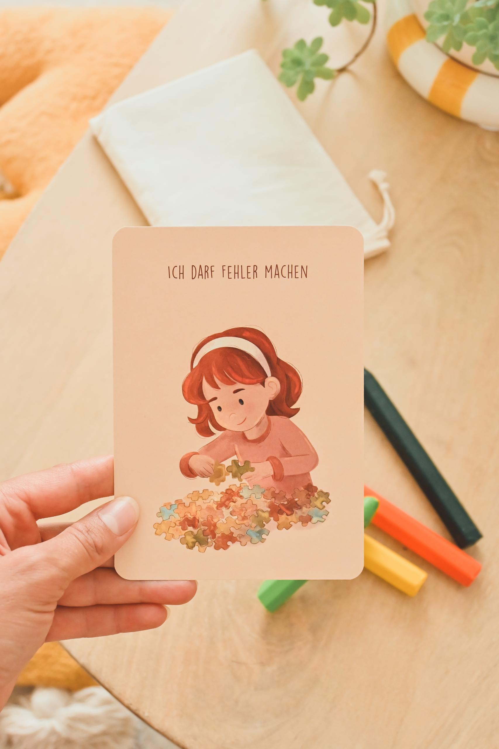 Die Karte ist handillustriert und greift eine kindgerechte Metapher auf. Auf der Rückseite wird die Affirmation in einfachen Worten erklärt, sodass Kinder die Bedeutung besser verstehen und auf ihren eigenen Alltag übertragen können. Dadurch entstehen kleine, wertvolle Momente des Gesprächs, der Reflexion und der Bestärkung.