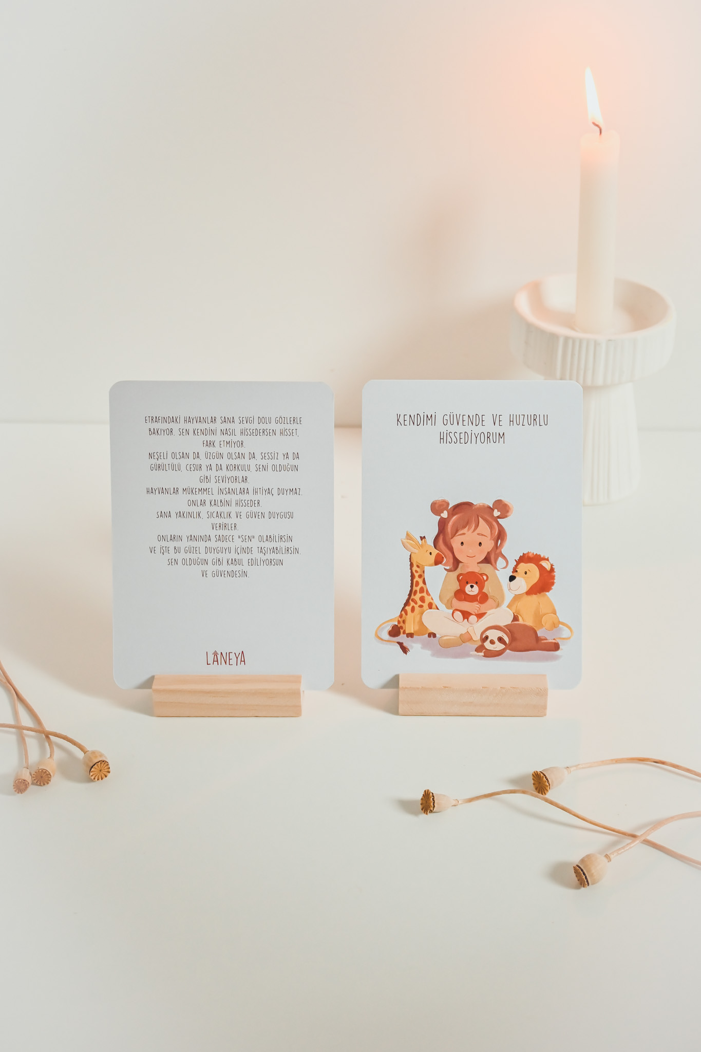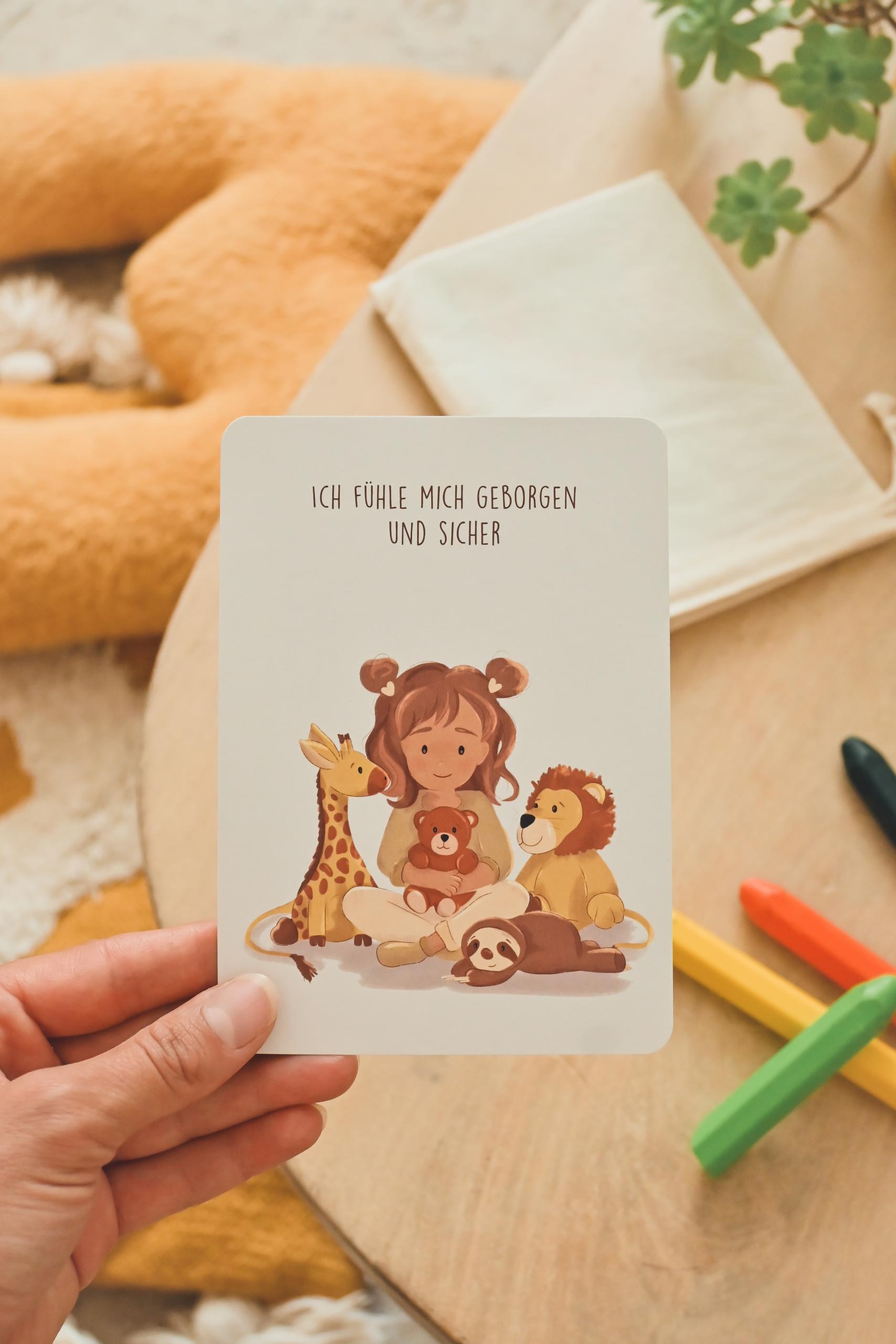 Die Karte ist handillustriert und greift eine kindgerechte Metapher auf. Auf der Rückseite wird die Affirmation in einfachen Worten erklärt, sodass Kinder die Bedeutung besser verstehen und auf ihren eigenen Alltag übertragen können. Dadurch entstehen kleine, wertvolle Momente des Gesprächs, der Reflexion und der Bestärkung.