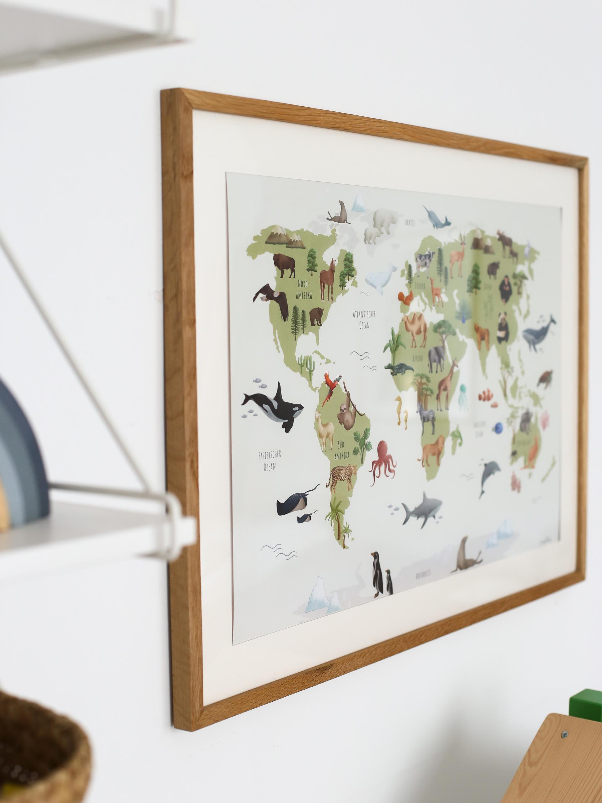 Bringe die Vielfalt unserer Erde ins Kinderzimmer mit dieser liebevoll illustrierten Weltkarte.