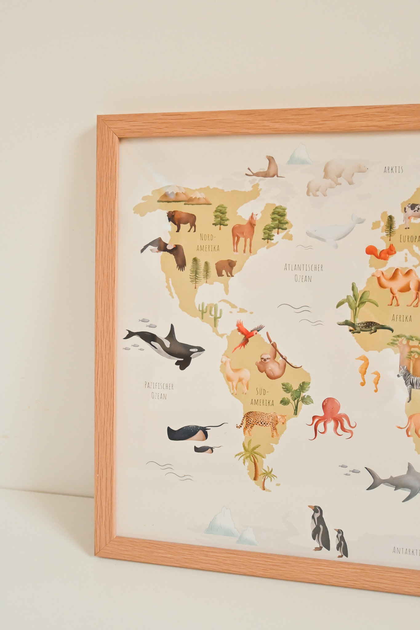 • Liebevoll illustrierte Weltkarte mit Kontinenten, Ozeanen und typischen Tierarten aus aller Welt 🌍