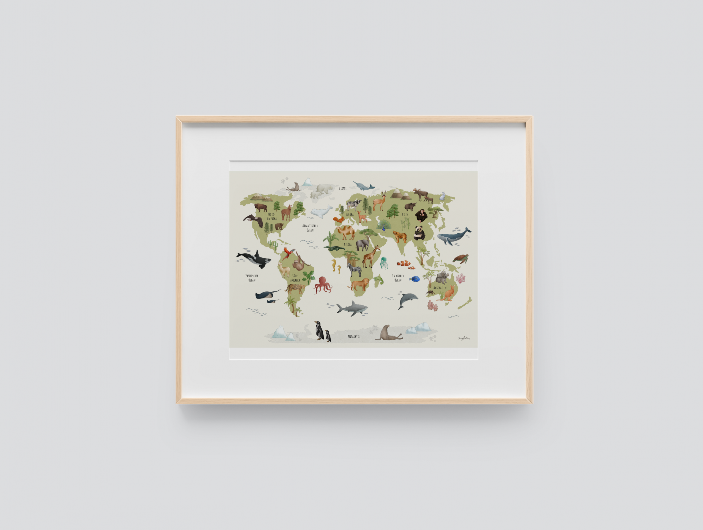Bringe die Vielfalt unserer Erde ins Kinderzimmer mit dieser liebevoll illustrierten Weltkarte.